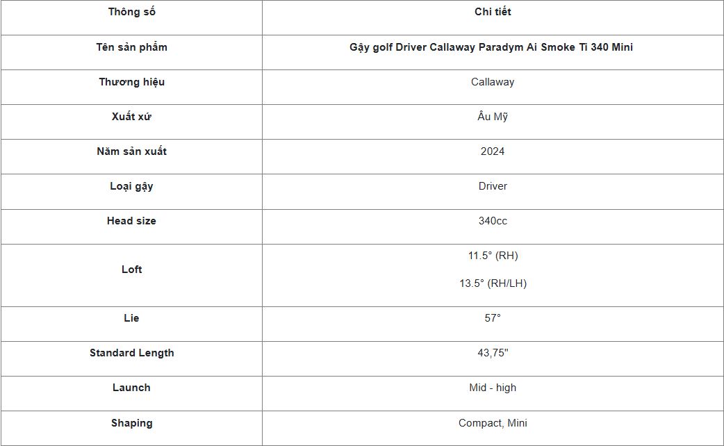 Với công nghệ AI và Titan, cùng với các tính năng như Face Cup và khả năng điều chỉnh linh hoạt, Gậy Golf Driver Callaway Paradym Ai Smoke Ti 340 Mini là một công cụ chơi golf tối ưu cho những golfer muốn tối đa hóa hiệu suất chơi của mình.